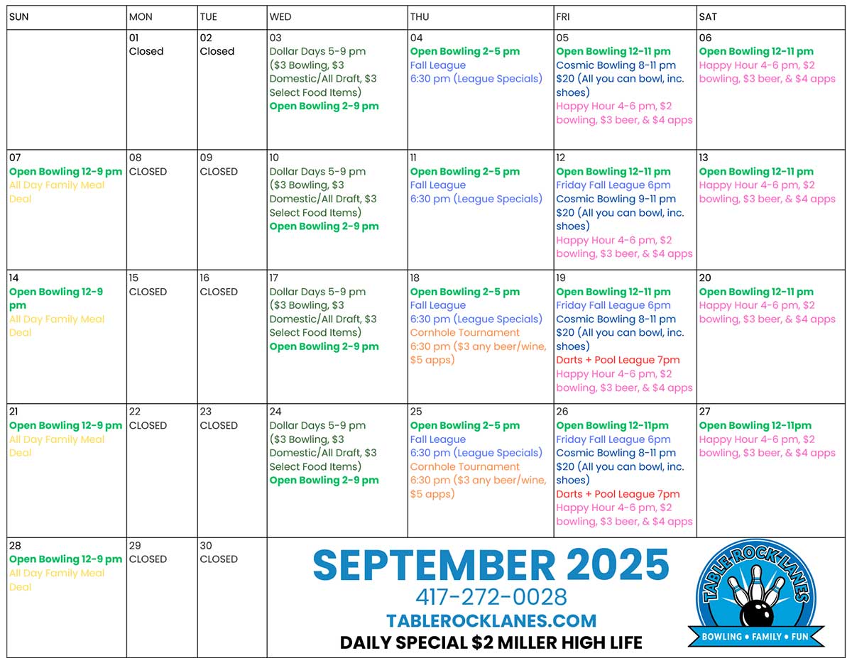 Monthly Calendars MONTHLY CALENDARS September hours: Wed and Thurs 2:00 pm – 9:00 pm Fri and Sat 12:00 pm – 11:00 pm Sun 12:00 pm – 9:00 pm